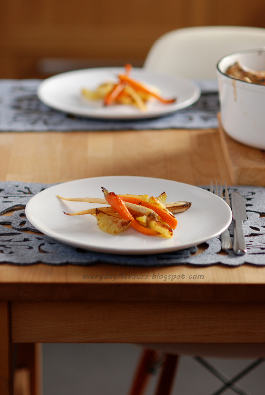 Do opisanego we wcześniejszym poście kurczaka polecam pieczone warzywa korzeniowe i znowu "mniej znaczy więcej".