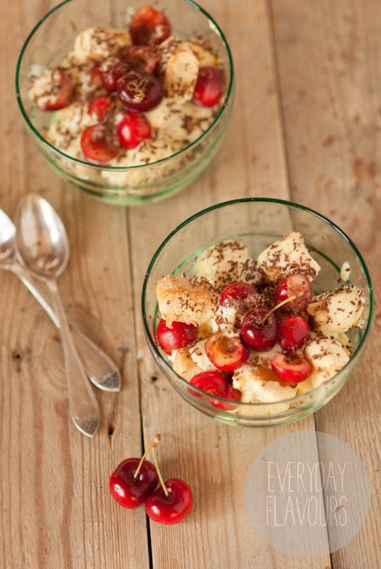 Jasne, ciemne, z robakiem w środku nie ważne które. Ważne że słodkie i soczyste. I że kojarzą się z latem, ze słońcem na skórze, ciepłym letnim deszczem i kolanem zdartym przy próbie wejścia lub zejścia z drzewa. Takie są te czereśnie. Najlepsze oczywiście saute, wypłukane pod strumieniem zimnej wody. Ale może się skusicie na taką wersję. Trilfe z czereśniami, ale nie do końca trifle bo bez galaretki i bitej śmietany. Taka moja wersja, prosta na podstawie tego co było w lodówce.Zapraszam :)