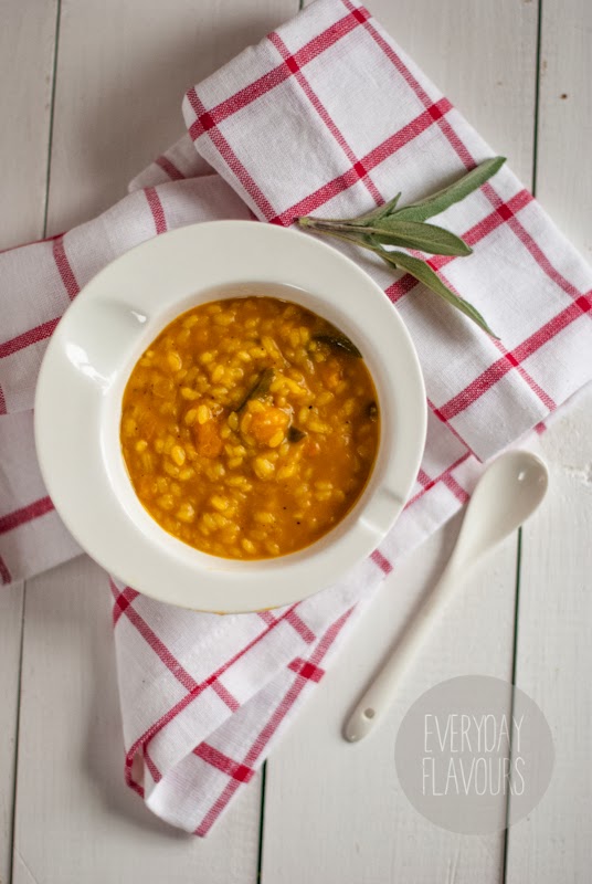 Dziś zapraszam Was na naprawdę pyszne risotto, które pobija moim zdaniem wszystkie poprzednie które do tej pory udało mi się przygotować. Tym razem niezwykle słoneczne w sam raz na taką szaroburość jak dziś. Z aromatem szafranu, dyni i szałwi. Biorę parującą miseczkę i idę zaszyć się pod kocem. Smacznego :)