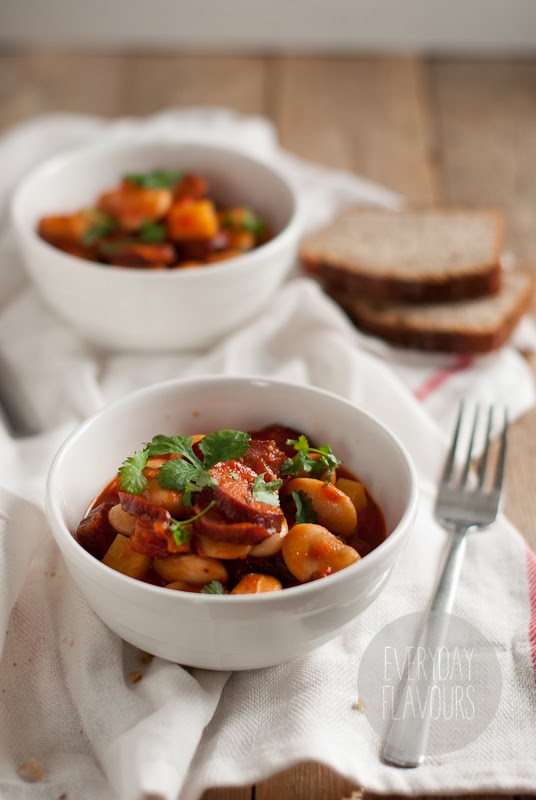 Wcześniej namoczoną fasolę umieścić w garnku z nową wodą i gotować około 20 minut do miękkości. Cebulę pokroić z drobną kostkę i wrzucić na patelnię z odrobiną oleju. Smażyć aż się zeszkli po czym dodać do niej kiełbasę pokrojoną w plasterki oraz ziemniaki pokrojone w kostkę. Gdy wszystko się porządnie zarumieni na patelnię dorzucić fasolę, pomidory z puszki, przecier pomidorowy, papryczkę chili, paprykę wędzoną a także sól i pieprz, całość zalać bulionem lub wodą. Wszystko razem dusić pod przykryciem około 15-20 minut aż ziemniaki zmiękną a wszystkie smaki się przegryzą. Na koniec doprawić sokiem z cytryny, świeżą kolendrą i cukrem. Podawać ciepłe z kawałkiem chleba.
