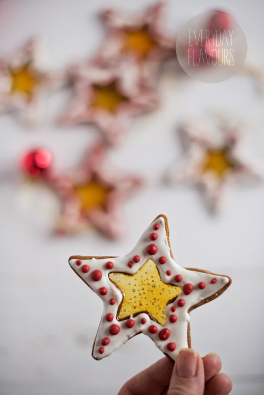 Landrynki rozkruszyć drobno. Ja zrobiła to przy użyciu wałka. Ciasto na pierniki rozwałkować cienko. Wykrawać pierniki po czym w wykroju środkowym umieszczać pokruszone landrynki. Piec zgodnie z przepisem na pierniczki. Po upieczeniu piernika zostawić na blaszce do ostygnięcia lub delikatnie przesunąć z papierem na kratkę.
