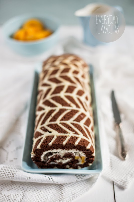Do tej pory jakoś nie byłam wielbicielką rolad. Chyba dlatego że u mnie w domu za bardzo się ich nie robiło, a te których do tej pory próbowałam nie przypadły mi do gustu. W sumie głównie ze względu na krem który zazwyczaj był tłusty, niedobry i jakiś sztuczny. Wyjątkiem jest ta ROLADA BEZOWA, która zostawiła bardzo miłe wspomnienie. Tą roladę ze wzorkiem też będę bardzo miło wspominać. Nie tylko ze względu na wygląd który jest bardzo widowisko ale głównie na smak który jest bardzo przyjemny dla podniebienia. Pyszny krem waniliowy z kawałkami soczystych brzoskwiń otulony miękki, kakaowym biszkoptem. Czego chcieć więcej. Chyba jedynie świeżych owoców bo z nimi na pewno będzie jeszcze lepsza.