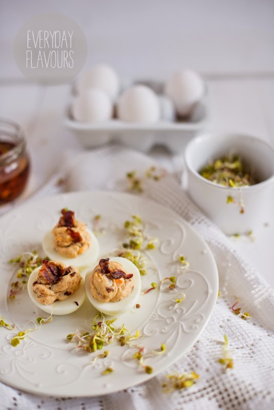 Jajka ugotować na twardo. Boczek ułożyć na blaszce wyłożonej papierem do pieczenia i wstawić pod grilla w piekarniku. Grillować aż z boczku wytopi się cały tłuszcz i stanie się on chrupiący i mocno zrumieniony. Obrać ze skorupek, przeciąć na pół i wydrążyć żółtka które następnie umieścić w misce. Do żółtek dodać ricottę, drobno starty parmezan, suszone pomidory drobno posiekane odsączone z oleju, zgrillowany wcześniej boczek pokruszony drobno oraz sól i pieprz. Nadzienie dokładnie wymieszać po czym całość umieścić w rękawie cukierniczym. Przed podaniem nadziać jajka.
