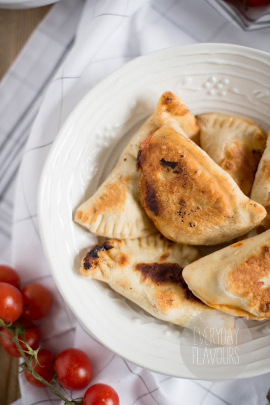 Dzisiaj przepis na obiad należący może nie do najszybszych dań ale na pewno wart poświęconemu mu czasu. Chociaż i tak w tej wersji przygotowanie go trwa krócej niż tradycyjne, drożdżowe calzone. Pomysł na nie podpatrzyłam u Zuzi u której znajdziecie całą gamę śródziemnomorskich przepisów. Najbardziej w tego typu nadziewańcach podoba mi się koncepcja szaleństwa z nadzieniami. Tak naprawdę do środka możecie włożyć cokolwiek przyjdzie Wam do głowy i za każdym razem możecie podawać nowe danie. Także łapcie za patelnie. Mini calzone będą w sam raz na jutrzejszy obiad.