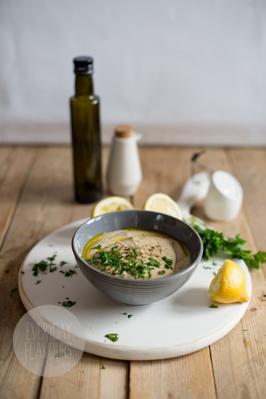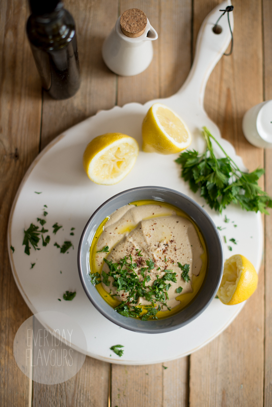 Dzień wcześniej ciecierzyce zalać wodą którą wymieszać z łyżeczką sody. Wody powinno być co najmniej dwa razy tyle co ziaren ciecierzycy. Następnego dnia ciecierzycę odcedzić i opłukać. Umieścić w garnku i zalać duża ilością wody wymieszanej z łyżeczką sody. Gotować około 40 minut aż ciecierzyca po zgnieceniu w palcach będzie kremowa i maślana. Ugotowaną ciecierzyce ponownie odcedzić i opłukać. Całość przełożyć do blendera. Dodać do niego także pastę tahini, sok z cytryny oraz ząbki czosnku. Wszystko zmiksować na gładką masę która nie powinna mieć grudek. Następnie do masy powoli dolewać lodowatą wodę. Wszystko miksować około 2-3 minut. Teraz hummus powinien zmienić się gładki krem. Przełożyć do miski po czym zalać oliwą i posypać posiekaną natką pietruszki. Podawać z pieczywem lub świeżymi warzywami.