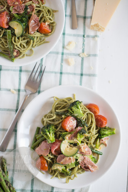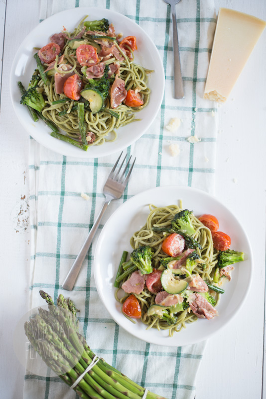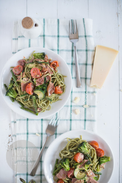 Miał być deser dzisiaj i to chłodzący, ale nie samymi lodami człowiek żyje a przeglądając nieopublikowane posty przypomniałam sobie o tym pysznym makaronie. Jeśli będzie Wam się chciało robić obiad w ten upalny dzień to polecam bardzo, zwłaszcza że dobrodziejstwo warzyw właśnie trwa. Jeśli nie uda Wam się dostać szparagów bo sezon na nie raczej się już zakończył, zastąpcie je czymś innym lub po prostu pomińcie.