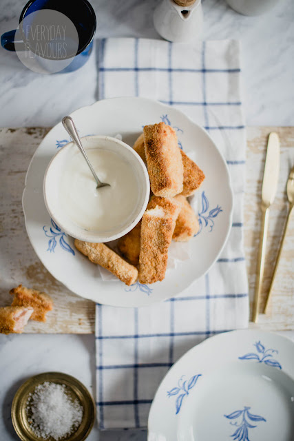 Piekarnik nagrzać na 190 stopni C. Filety umyć, osuszyć, oskórować i pokroić na paluszki. Kawałki ryb posolić i popieprzyć. Następnie każdy kawałek obtoczyć w mące, jajku oraz bułce tartej. Układać na blaszce i skropić oliwą. Blachę umieścić w nagrzanym piekarniku i piec około 15 minut, do zrumienienia panierki. Paluszki podawać z cytryną, sosem jogurtowym i pieczonymi ziemniakami.