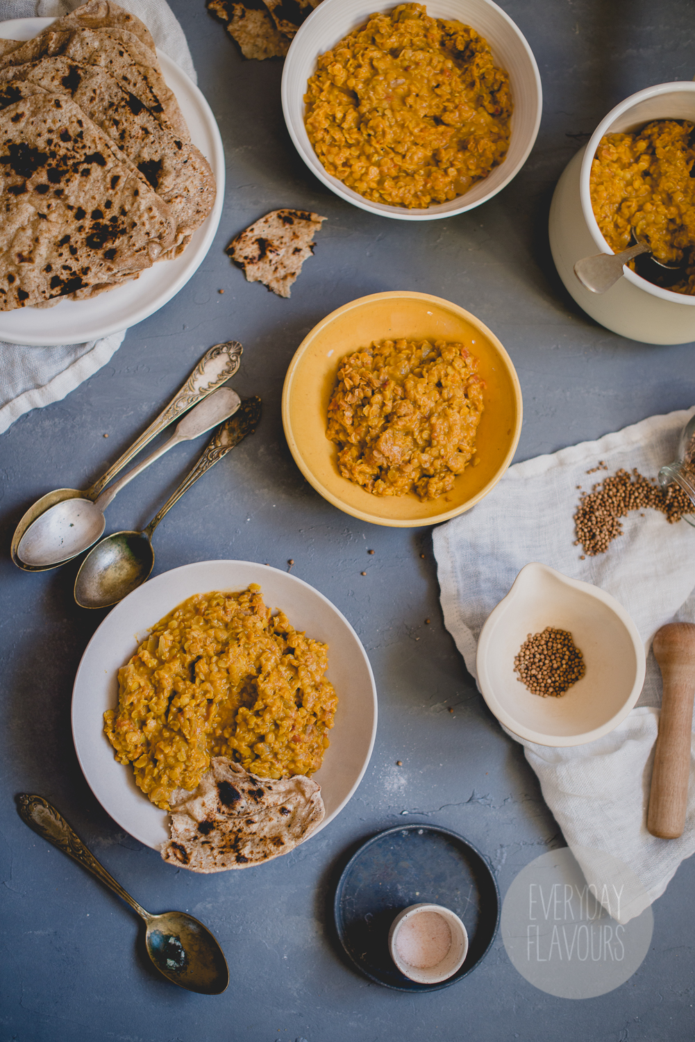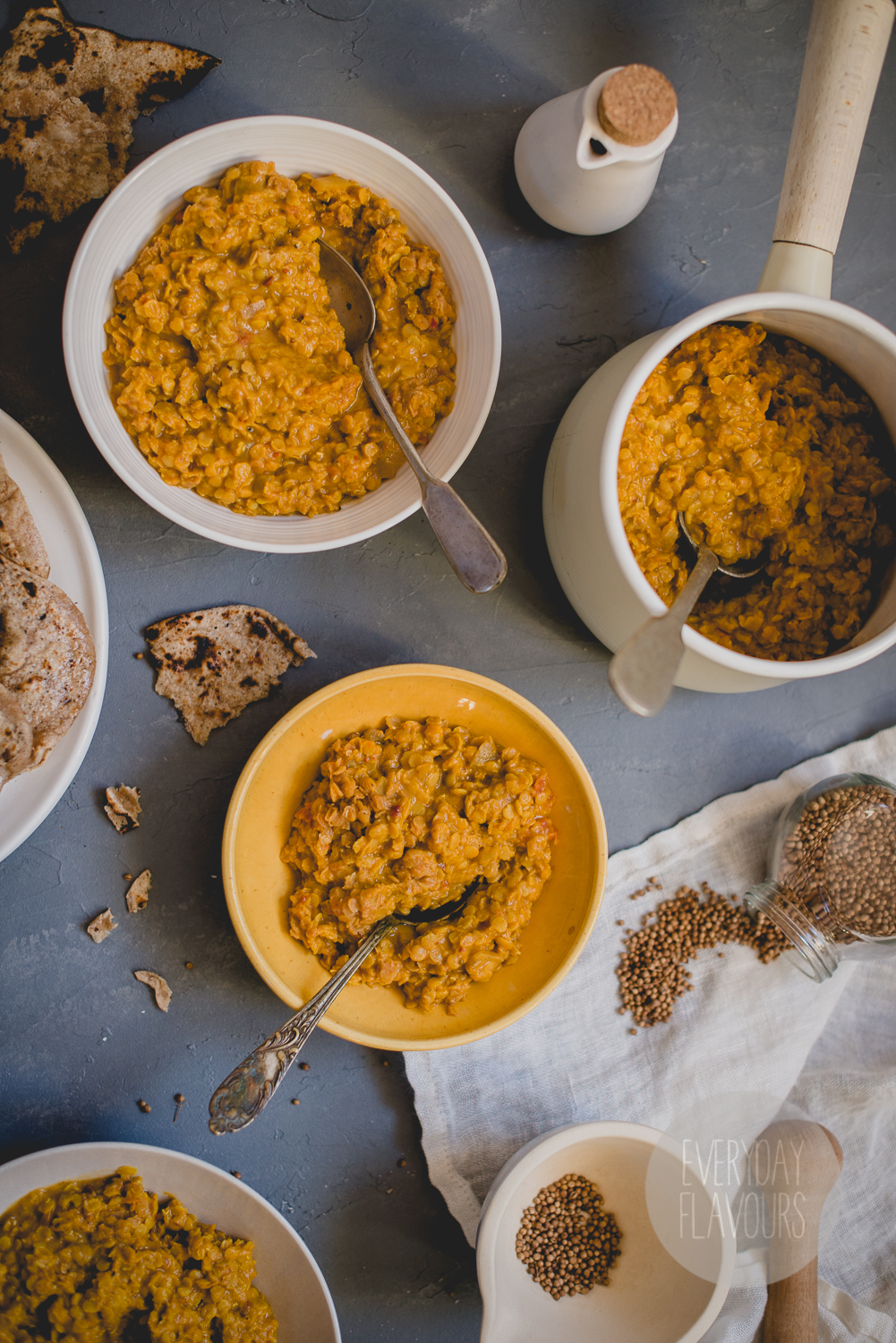 W garnku z grubym dnem umieścić olej oraz posiekaną w kostkę cebulę. Chwilę smażyć po czym dorzucić wszystkie przyprawy.Całość podsmażać mieszając. Gdy przyprawy zaczną przyjemnie pachnieć do garnka dorzucić opłukaną wcześniej soczewicę. Chwilę prażyć w garnku razem z przyprawami po czym całość zalać pomidorami z puszki oraz wodą. Danie dusić pod przykryciem na małym ogniu około 20 minut, do czasu aż soczewica zmięknie. W razie konieczności dolać więcej wody. Na koniec całość posolić. Podawać z jogurtem oraz chlebkami roti.