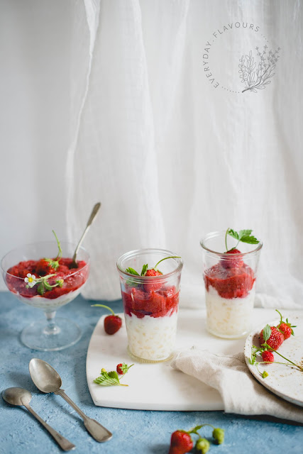A w sumie to ma, bo nie od dziś wiadomo że proste połączenia smaków są najlepsze. I tak oto tu mamy lekko kokosowe kulki tapioki pękające między zębami skąpane w duszonych truskawkach z rabarbarem.