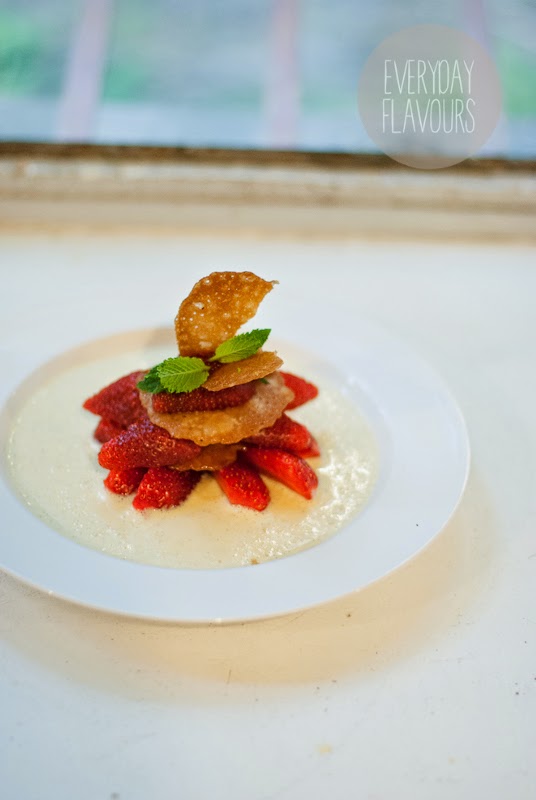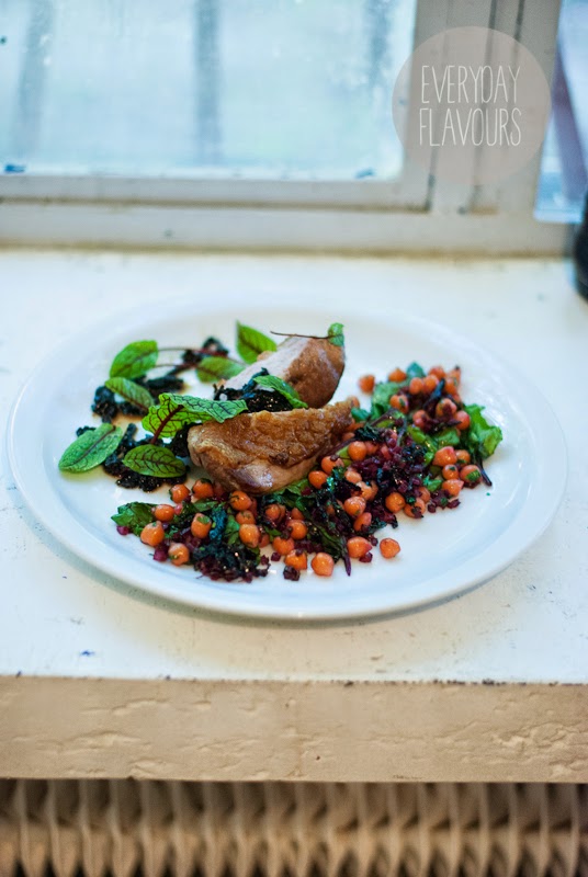 Najpierw szefowa kuchni zaprezentowała przygotowywanie dań które w następnej kolejności mieliśmy przyrządzić samodzielnie. Zaczęło się od gotowanych szparagów z jajkiem poszetowym, winegretem i szynką parmeńską, następnie przygotowywaliśmy przepyszny i idealnie trafiony w pogodę orzeźwiający chłodnik z arbuza i truskawek z chilli. Daniem głównym natomiast była kaczka, tak kaczka bez soli na sałatce z botwiny z ciecierzycą. To danie zdecydowanie budziło największe zaciekawienie jak i najwięcej kontrowersji. Jeśli o mnie chodzi to nie podbiło mojego serca ale było do zjedzenia, zwłaszcza gdy kawałki kaczki zanurzało się w maślanym sosie z wędzonymi śliwkami. Koniec warsztatów zwieńczyliśmy prostym i pysznym deserem a mianowicie kremem anglaise z brandy snapsami i truskawkami. Jak zawsze ciekawie spędzany czas w miłym towarzystwie umyka niesamowicie szybko i tak było w tym przypadku. Chciałam podziękować Pani Ewie, Cisowiance oraz blogerkom za niezwykle miło spędzone warsztaty.
